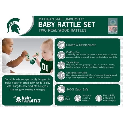 This set of two Michigan State rattles is designed to make it easy for small baby hands to play with. Baby-friendly products help your little fan grow healthy and happy. Growth & Development toys offer Co-Play Fun, Tactile Play, and Sensorimotor Skills. Show baby how to shake the rattles to make noise. Your smile encourages baby to keep playing as you teach them new skills. Help baby develop grasping and fine motor skills. Knobs, handles, and rings offer various shapes for baby to explore. Baby discovers cause-and-effect of movement making sound. Rings shake against each other to create rattle sounds. Real wood rattles are 100% Baby Safe made with real wood, non-toxic colors & finishes, and free of BPA, phthalates, & formaldehyde.