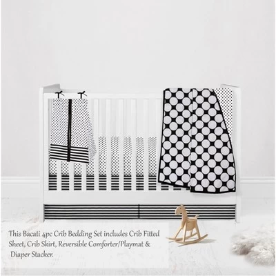 - This Bacati 4-piece Crib Set Includes Reversible Comforter/Playmat (33 x 43 inches), Crib fitted sheet (52 x 28 x 6 inches), Crib Skirt/Dust ruffle (13 inch drop) and Diaper Stacker (holds more than 30 newborn diapers) in fun, colorful and signature prints in 100 percent cotton 200 Thread Count percale fabrics. Designed in United States by Experienced Designers. Many coordinating items available to purchase separately in this Bacati Dots Stripes Black/White Bedding Collection.
