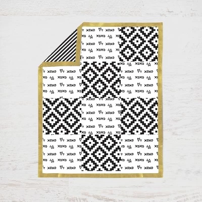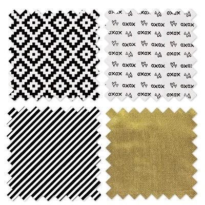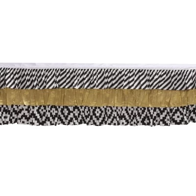 - This Bacati 4-piece Crib Set Includes Reversible Comforter/Playmat (33 x 43 inches), Crib fitted sheet (52 x 28 x 6 inches), Crib Skirt/Dust ruffle (13 inch drop) and Diaper Stacker (holds more than 30 newborn diapers) in fun, colorful and signature prints in 100 percent cotton 200 Thread Count percale fabrics. Designed in United States by Experienced Designers. Many coordinating items available to purchase separately in this Bacati Love Black Gold Bedding Collection.