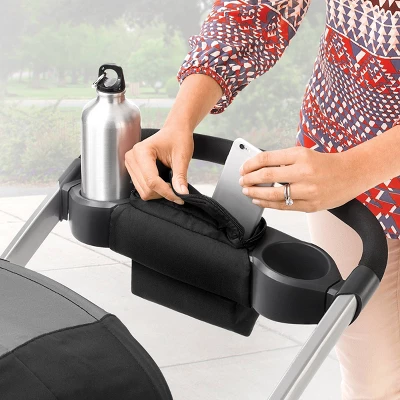 Treaded rubber tires, full suspension, and front swivels help maintain a smooth ride for both passengers in every configuration. One-touch brakes keep the stroller in place when parked. A padded push-handle, parent tray with two cup holders, and large storage basket with front and rear access provide added convenience for mom or dad.