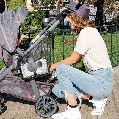The Disney Baby Side Sling Stroller Cargo Net by J.L. Childress is about to be your (and your stroller’s) best friend. This multi-functional design can be used on either or both sides of almost any stroller. It adds easy-access storage for toys, sweatshirts, snacks, drinks and more! It features a wide elastic opening and securely attaches to your stroller’s side bar with 2 non-slip adjustable straps. Its contoured design blends with your stroller frame, and a touch of Mickey adds the magic you’ve been looking for!