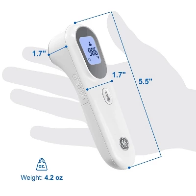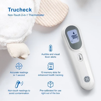 Take Control of Your HealthRemove all the complications from taking your temperature with this Non-Touch 2-in-1 ThermometerPowered by GE’s pioneering healthcare technology, this thermometer provides quick, accurate temperature readings without the risk of cross-contamination. Fever alerts and automatic memory provide reliable health information for greater peace of mind.More Memory for Better CareTrack trends to better understand your health with the built-in memory feature. This thermometer stores the last 10 measurements to help you track your health over time.Use this thermometer for all your needs with body and surface modes. Take total control of your healthcare with this Non-Touch 2-in-1 Thermometer.Powered by GE – Using GE’s pioneering health technology, this thermometer brings the best in healthcare to your homeFast temperature readings – At the push of a button, get accurate temperature readings in just 1 secondContactless readings – The contactless design provides instant temperature readings with no risk of cross-contaminationFever alerts – Identify potential health risks with audible and visual alerts for temperatures above the normal rangeBody and surface modes – Reads both body and surface temperatures for added flexibility