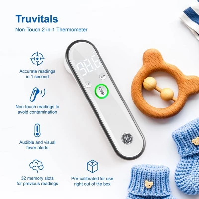 - Truvitals non-touch 2-in-1 thermometer; Accurate readings in 1 second; Non-touch readings to avoid contamination; Audible and visual fever alerts; 32 memory slots for previous readings; pre-calibrated for use right out of the box.