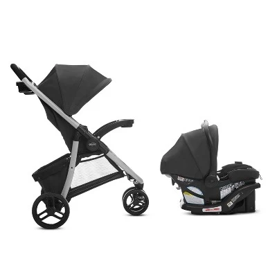 The Graco® Pace™ 2.0 Travel System features a nimble 3-wheel design to make it easy to stroll anywhere. Whether your day includes a picnic in the park, a trip to the grocery store, or a play date with friends, the Pace 2.0 can keep up with your busy life. This travel system includes the SnugRide 35® Lite Infant Car Seat to help protect rear-facing infants from 4-35 lb and up to 32″. The stroller has a one-hand, self-standing fold, and the child’s tray folds compactly with the stroller, making for easy use and storage. Parent and child trays with cup holders allow you to keep drinks and snacks close at hand, so your ride is comfortable and convenient for all. An extra-large canopy with peek-a-boo window keeps baby shaded and lets you keep an eye on them while you stroll. The large storage basket holds all your essentials while on the go. The multi-position, reclining seat keeps baby comfortable, and the convertible 3- or 5-point harness with harness covers makes for a secure ride at every stage. The stroller holds up to 50 lb for years of strolling together. Set the pace for every adventure with the Pace™ 2.0.