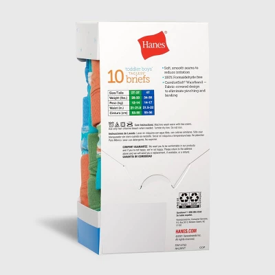 These Hanes Toddler Boys’ Brief 10-Pack. Super-soft cotton designed to last wash after wash. TAGLESS so there is no itchy, irritating tag. They have a soft-backed waistband that moves with him and eliminates pinching and binding. Easy to pull up and pull down. This 10-pack includes a variety of colors and prints.