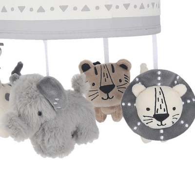 Four soft plush jungle animals decorate this charming musical mobile. There is one elephant, one tiger, one giraffe, and one lion. They all have embroidered faces and are made of a soft, fuzzy velour. They rotate underneath a taupe ring adorned with a geometric print twill tape. The scrunchie which covers the mobile arm is a creamy white velour. The music box has a sticker of our friendly sloth Speedy. The musical mobile rotates to nursery songs for 20 minutes, has an on/off switch and volume control. It plays Brahms Lullaby, Twinkle, Twinkle Little Star and Rock-a-Bye Baby. Requires 3 AAA batteries, not included.