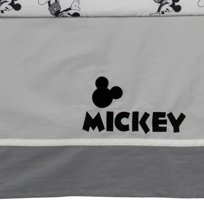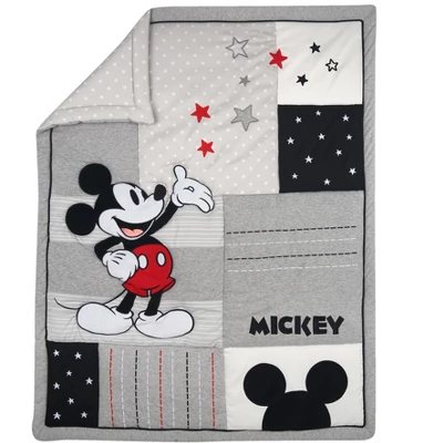 Transform your nursery into the Magical World of Disney with this spectacular baby bedding collection called Magical Mickey Mouse. The 3-piece set includes one quilt, one 100% cotton fitted crib sheet and one crib skirt. Classic Mickey Mouse loves wearing his favorite red shorts, white gloves and shoes. He is expertly appliqued and embroidered on a heather gray cotton ground. Elaborated bean stitching is featured along with embroidered stars and included is Mickey’s famous black ears. The 100% cotton fitted crib sheet is on a white ground with Mickey in various positions. The fitted sheet has elastic all around providing a safe and secure fit. The crib skirt gives the finishing touch to your child’s crib. It is a gray twill bordered with a darker gray twill on the bottom and separated by a white cotton flange. The front lower right corner is appliqued with the word MICKEY along with his famous black ears.