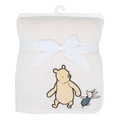 Cuddle your little one in this soft creamy white minky blanket. Disney’s lovable Classic Pooh is appliqued with his forever friend Piglet. The back of this Winnie the Pooh blanket is a luxurious white faux shearling. Sized at 30” X 40” this stroller blanket makes a great baby shower gift and is a favorite baby registry item.