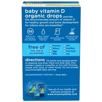 Mommy’s Bliss® Vitamin D Organic Drops provide the recommended amount of Vitamin D (400 IU) for healthy growth* and bone development* for babies who are breastfed. For all breastfed infants or older children who consume less than 32 ounces of vitamin D-fortified formula or milk, pediatricians recommend a daily liquid supplement. Mommy’s Bliss Organic Vitamin D Drops is independently tested and certified by NSF to meet standards for quality, safety and label claims.
