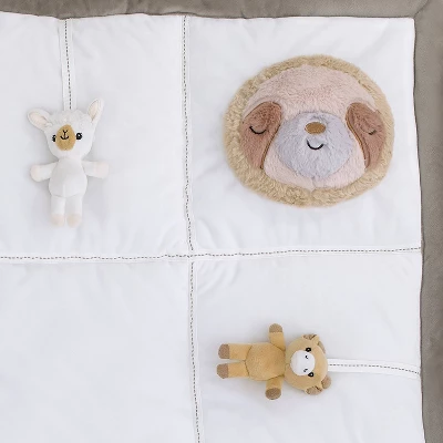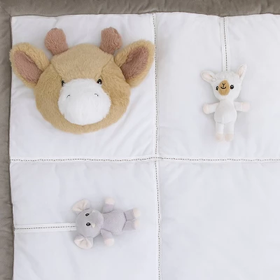 This Playful Pals Tummy Time Plush Mat features four 3D animals and three plush toys attached with ribbon. Each character head has crinkle inside for sensory play! The three small plush toys attached with ribbon have squeakers. Animals included are a llama, elephant, sloth and giraffe. A cord like fabric decorates the solid ivory reverse side. A velvet like trim in gray decorates the border. Measures 32.5″ x 32.5″. Perfect for keeping baby entertained. Made with super soft plush fabrics!