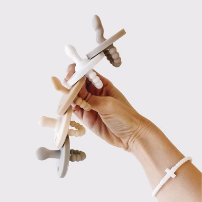 The Cutie PAT (Pacifier And Teether) is a multifunctional 2-in-1 patented design. The nipple was created to soothe, while the teether was developed to aid in teething relief. All Cutie PAT styles are a safe, one-piece design made out of 100% medical-grade silicone. They have a large shield for teething, and large holes for safe breathing. The teether handle provides comfort for sore gums, and also makes it easy for baby to hold and place in their mouth.
