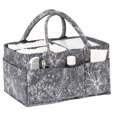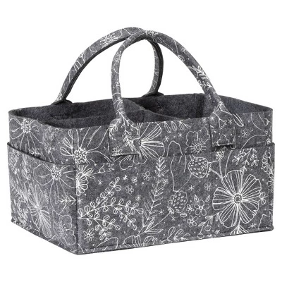 Our soft & sturdy Gray and White Floral Felt Storage Caddy is designed to keep diapers, wipes and changing items organized. Sturdy felt handles allow the caddy to be easily moved from room to room. The body and handles feature a white floral pattern printed on a gray felt with a gray interior. The Storage Caddy also functions as an essential organizer for hair products, crafts, office and pet supplies, automotive and other necessities. Coordinating accessories and room décor by Sammy and Lou are available and sold separately.