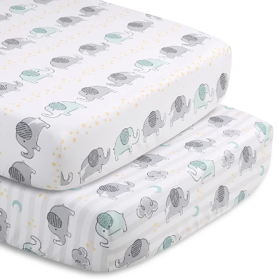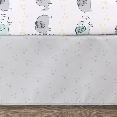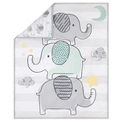A stack of playful elephants stands tall in this 5-piece Elephant Dream baby bedding set from The Peanutshell. Our generously sized 32″ x 41″ soft and cozy quilt features a trio of gray and aqua elephant friends a top a wide light gray stripe and surrounded by a sky of moons, clouds, and stars. The quilt is finished in a gray border. The tossed character fitted crib sheet comes in a perfect universal fit, designed for a standard 28″ x 52″ crib mattress with snug fitting all around elastic. A second fitted sheet print features a linear layout of parading elephants and rows of yellow stars. The tonal gray star printed bed skirt rounds out this gender-neutral look. The 30″ x 40″ burnout velour blanket with gray and aqua elephant silhouettes is the perfect accessory for stroller walks or comfy cuddles.