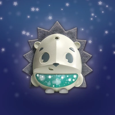 A Smart Soother for a Restful NightThe Tiny Love Sound ’n Sleep Projector Soother is the perfect sleepy time friend for your little one. This adorable Marie Hedgehog starlight projector sends a lovely array of delightful stars onto the ceiling to lull babies into a peaceful slumber. It also contains a clever mp3 player that allows you to download up to an hour of your baby’s favorite songs directly into the soother for a one-of-a-kind experience. A smart sensor automatically activates your personalized soothing music and lights when baby cries and features an auto timer that can be set for 15, 30 or 60 minutes. The auto-timer can also be used with the built in soothing sounds: 35 minutes of different melodies and a selection of nature sounds. In addition to the projected stars and music, the soother includes a soft glowing nightlight that helps comfort baby during quiet times. Having a sleepy time friend nearby helps make bedtime fun for everyone.